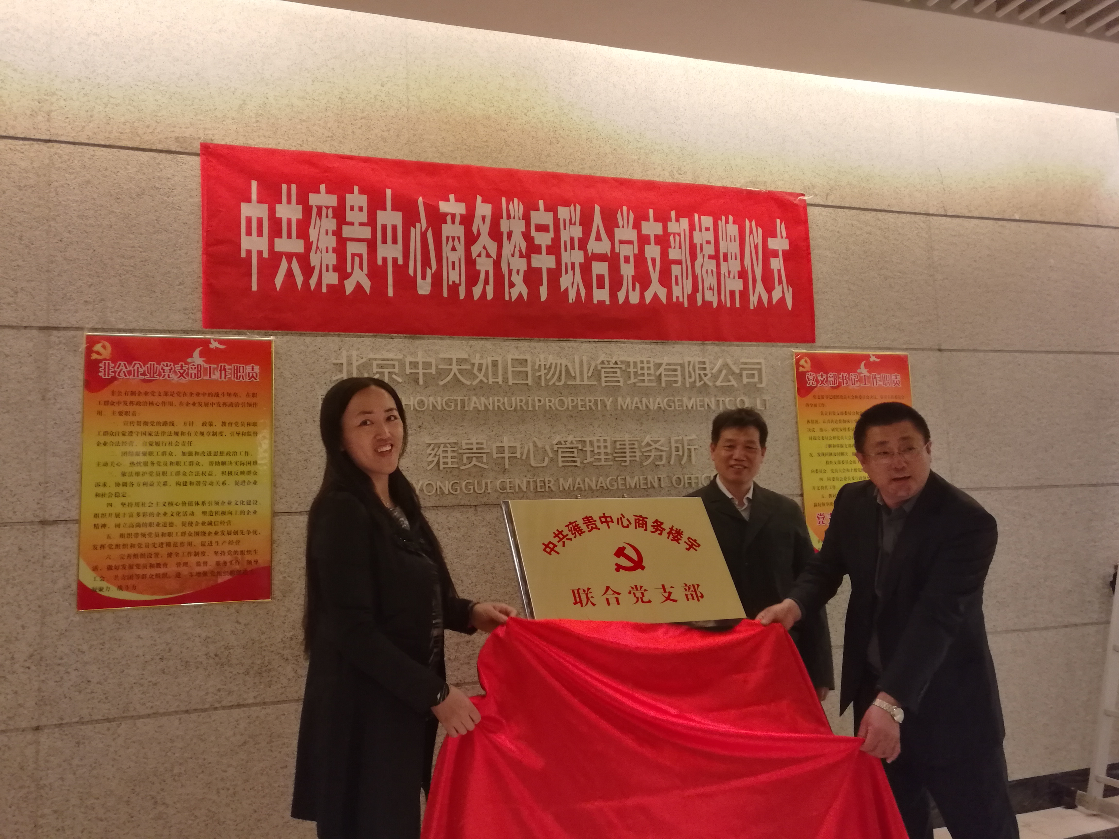会议由街道处级副调研员吴志华主持并宣布了街道工委同意成立雍贵中心联合党支部的决定。在热烈掌声中,街道处级调研员吴志华和物业经理韩浩杰、联合党支部书记吕佳共同揭牌。