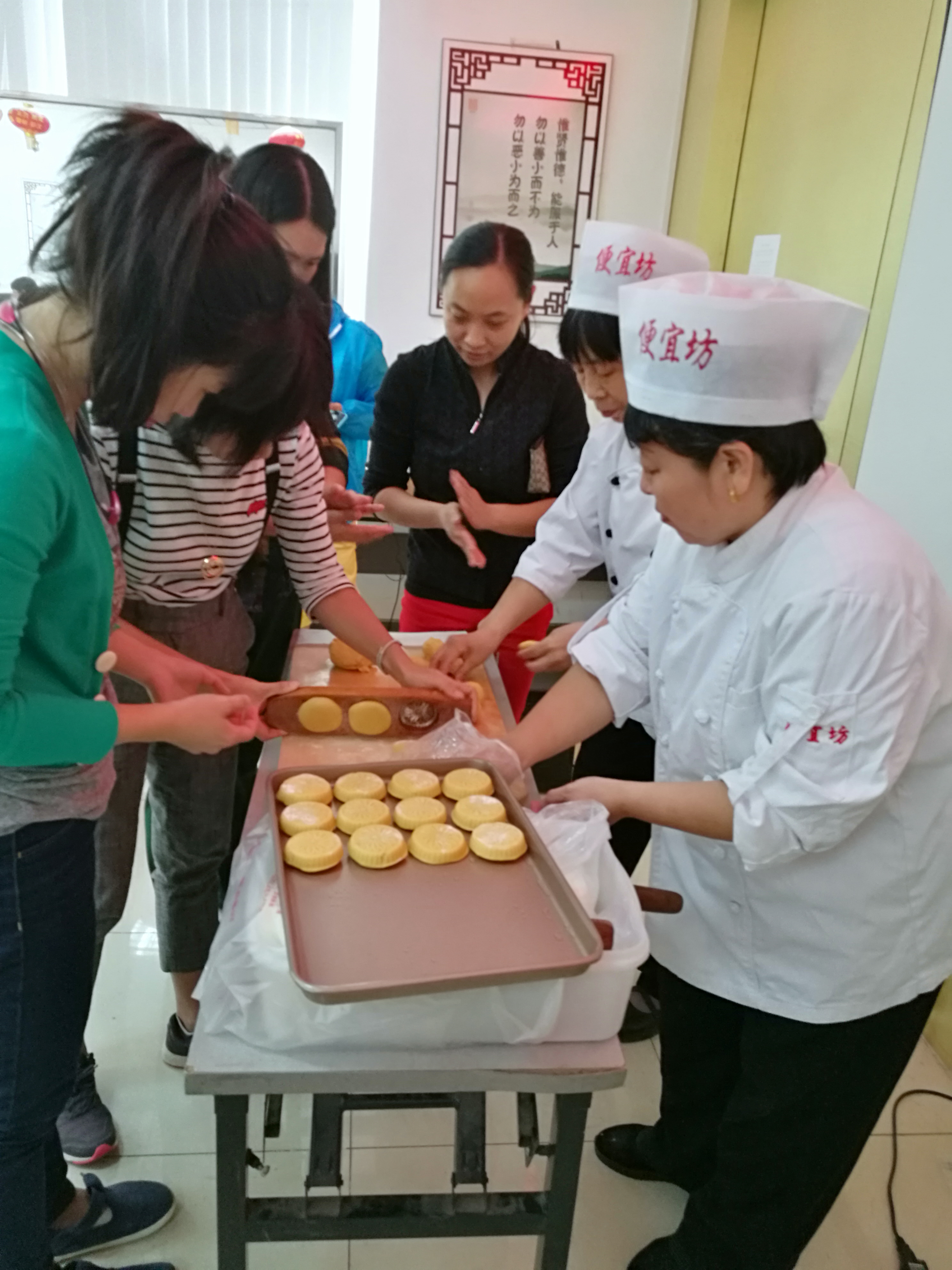 活动特邀请便宜坊烤鸭店专业师傅给大家讲解月饼的制作过程,并亲自给大家做示范。大家都跃跃欲试,迫不及待地拿起材料做了起来。在师傅的指导和帮助下,大家揉面团、擀皮、按压、包馅等,很快,一个个圆形的月饼在大家的巧手下诞生了,随后,工作人员把做好的月饼放进烤箱进行烘烤。